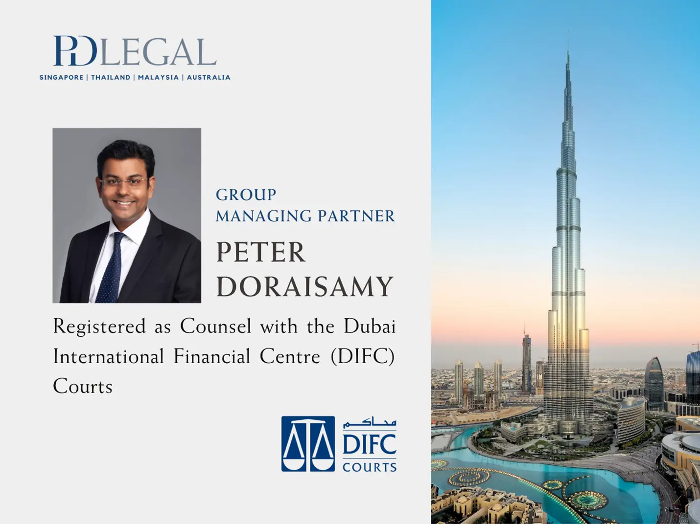 We are pleased to announce that our Group Managing Partner, Peter Doraisamy, has been registered as Counsel to the Dubai International Financial Centre (DIFC) Courts.